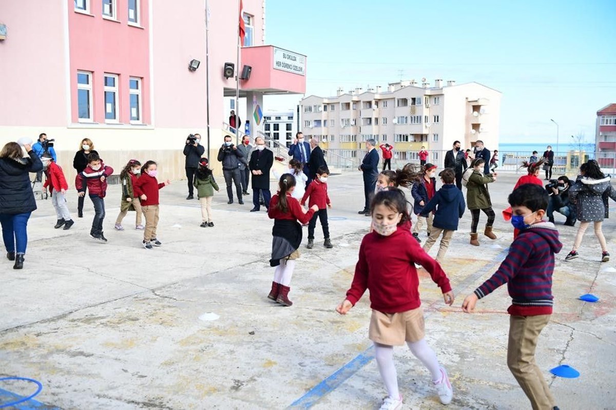 Trabzon'da 4 ay aradan sonra tekrar okullarına kavuşan öğrenciler kolbastı eşliğinde mesafeli oyunlar oynayarak sınıflarına girdi.